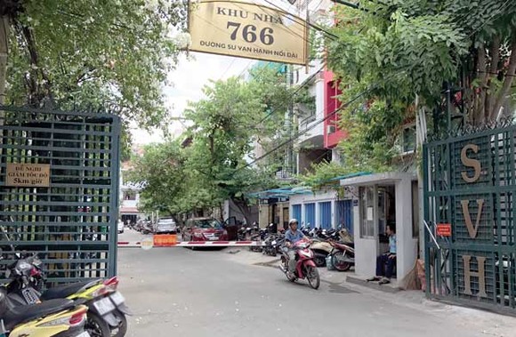 Trưa nay, hơn chục dân quân tự vệ, dân phòng và công an lập rào phong toả 4 dãy nhà cao 10 tầng tại lô b của chung cư sư vạn hạnh.